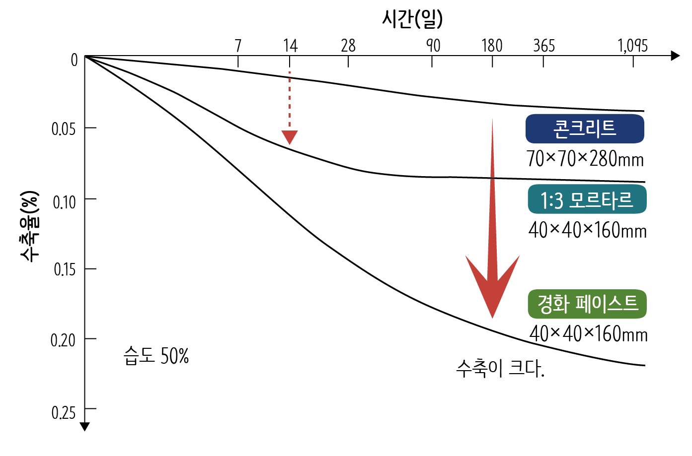 위 표를 보면 모르타르를 바르고 나서 2주(14일) 정도까지 수축이 계속 증가하는 것을 알 수 있습니다. 2주 정도가 지나야 수축이 어느 정도 줄어듭니다. 따라서 초벌을 바른 후에는 반드시 2주를 기다려야 정벌 바름에서 균열이 발생하는 것을 막을 수 있습니다.
