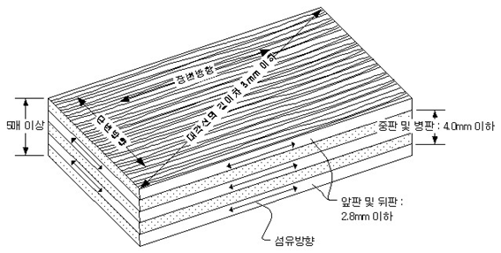 합판은 얇은판(단판)을 1장마다 섬유방향이 직교방향이 되도록 홀수겹(3,5,7,9, … 등)으로 겹쳐서 만든 판입니다. 이렇게 만들면 맨 바깥에 위치한 판의 섬유방향이 서로 일치하게 됩니다.