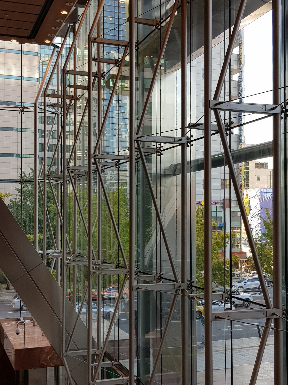 건물 주출입구 부분의 개방감을 높이기 위해 2개 층이나 3개 층 정도의 높이로 유리를 제작하고 금속 클램프를 이용해서 매달아 고정하게 됩니다. 멀리언을 사용해 보강할 수도 있지만 유리 리브를 부착해서 보강하는 것이 투명성을 강조할 수 있습니다.