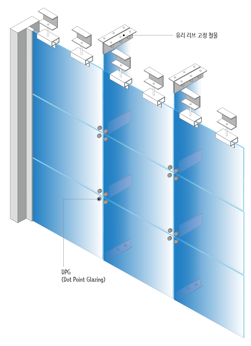 DPG(Dot Point Glazing System)는 유리에 구멍을 뚫어 볼트로 고정하고 지지체에 매다는 방법을 말합니다. 위 그림에서 오른쪽에 있는 그림입니다. DPG는 멀리언에 고정하거나, 투명성을 높이기 위해 유리 리브(Glass fin)에 고정하기도 합니다.
