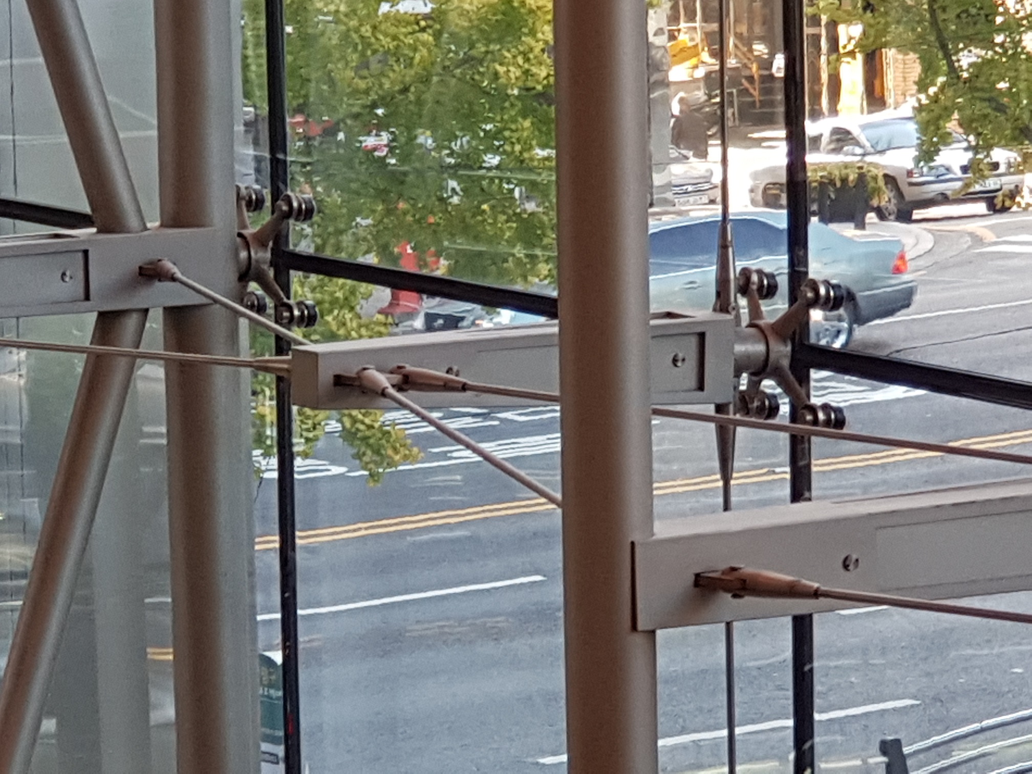 SGS 공법은 강선으로 된 케이블로 하중을 지지하고, DPG 방식으로 유리를 고정할 수도 있습니다. 얇은 강선을 사용하면 유리와 어울려 가벼운 느낌을 줄 뿐만 아니라 팽팽하게 당겨진 케이블이 구조적인 기능을 잘 표현해 줍니다.