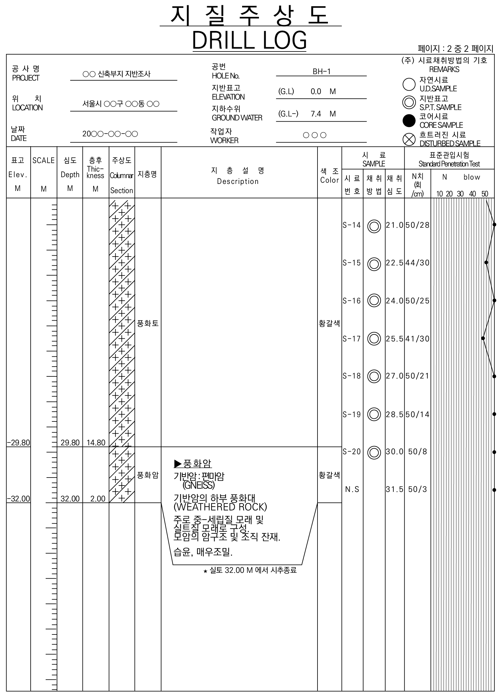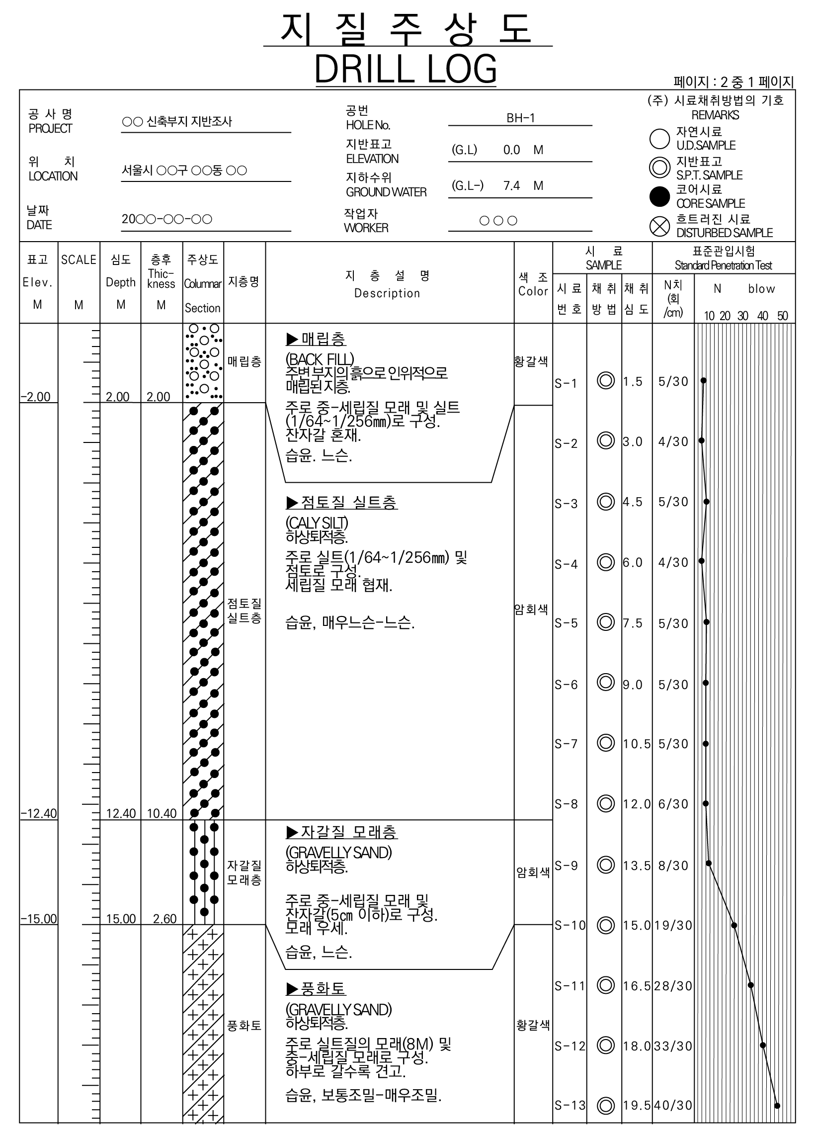 이렇게 보링을 해서 시추조사, 표준 관입 시험을 수행하면 기초 지반의 분포현황나 구성상태, 각 지층의 공학적 특성을 어느 정도 파악할 수 있고 이것을 그림으로 표현한 것이 주상도입니다. 다음 주상도 실제 사례를 보면 오른쪽 편에 1.5m 깊이마다 표준 관입 시험의 결과값이 제시되어 있는 것을 볼 수 있습니다. 대부분의 지층은 땅속으로 들어갈수록 지반이 단단해셔 N값이 증가하게 됩니다.