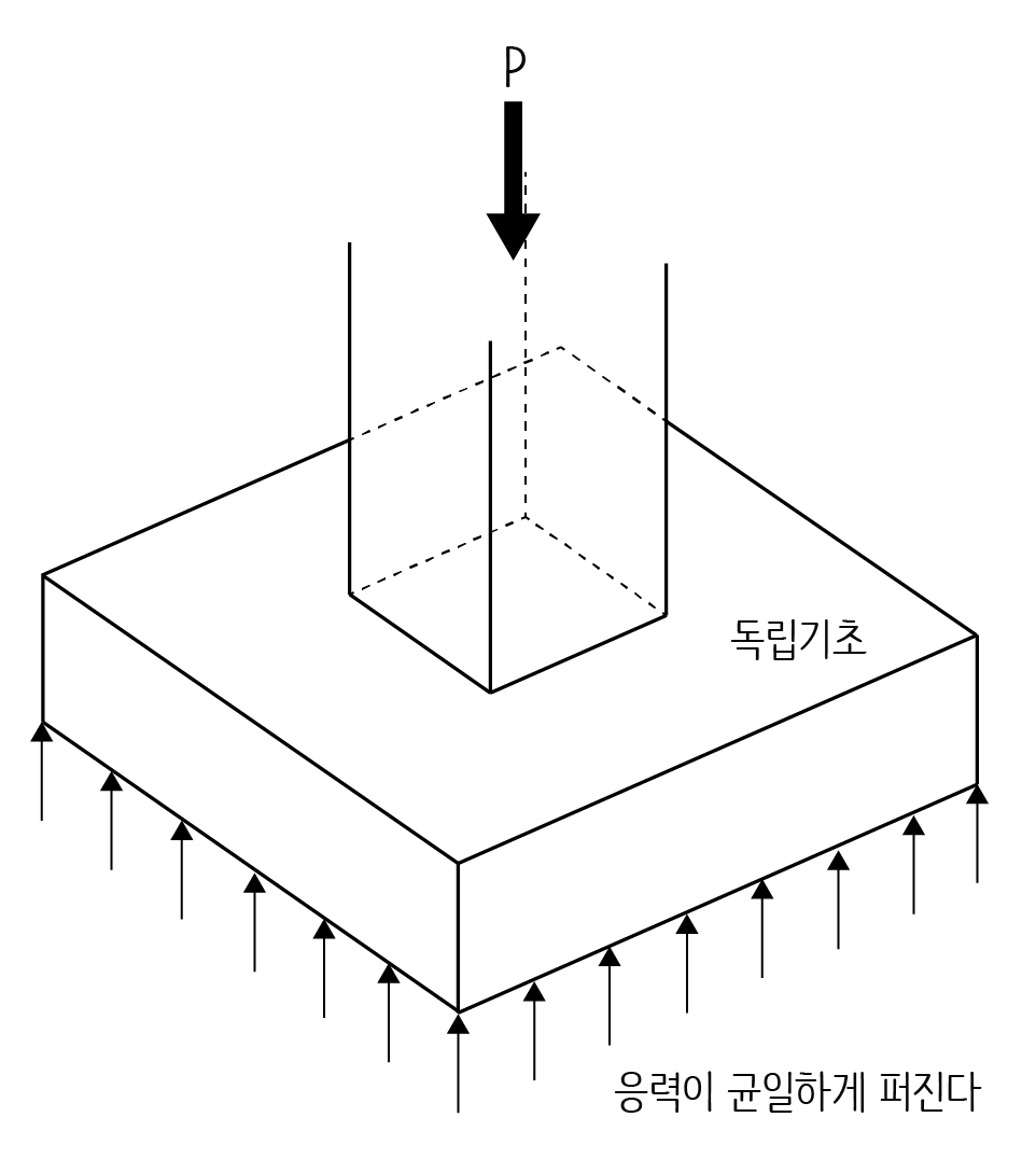 독립기초에서 지반이 약하면 두께가 얇고 넓은 형태가 되고 지반이 단단하면 두께가 두껍고 좁은 형태가 됩니다. 암반이 기둥을 받치고 있다면 좁고 기다란 기둥을 그 위에 세우는 것만으로도 충분히 기둥의 하중을 지탱할 수 있을 것입니다.