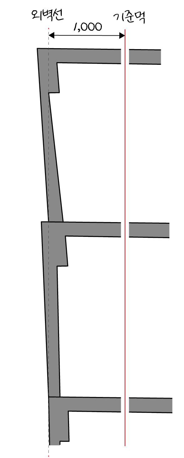 왜 이렇게 기준먹을 잡을까요? 예를 들어 아래 그림처럼 각 층을 시공할 때마다 조금씩 오차가 발생한다고 가정해보겠습니다. 구조체를 시공할 때 거푸집이 제대로 고정되지 않아서 조금씩 왔다갔다 한다고 가정해보면 어느 정도 오차가 발생할 수 있습니다. 그러나 1m 안쪽에 있는 기준먹을 따라서 각 층마다 새로 건축물의 외벽선을 맞추어간다면 오차를 계속 수정할 수 있습니다.