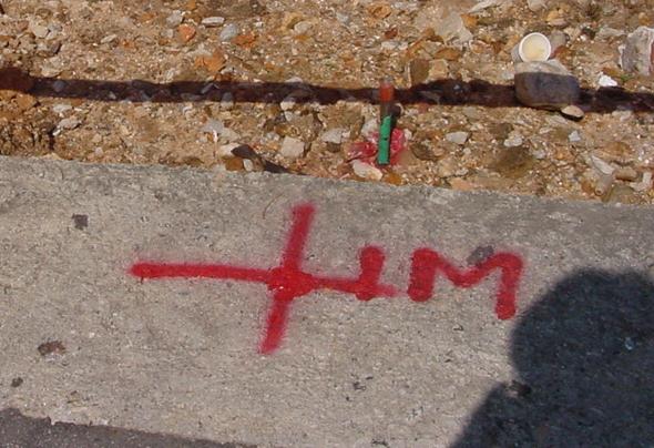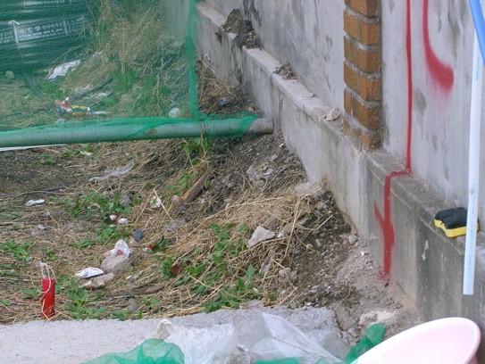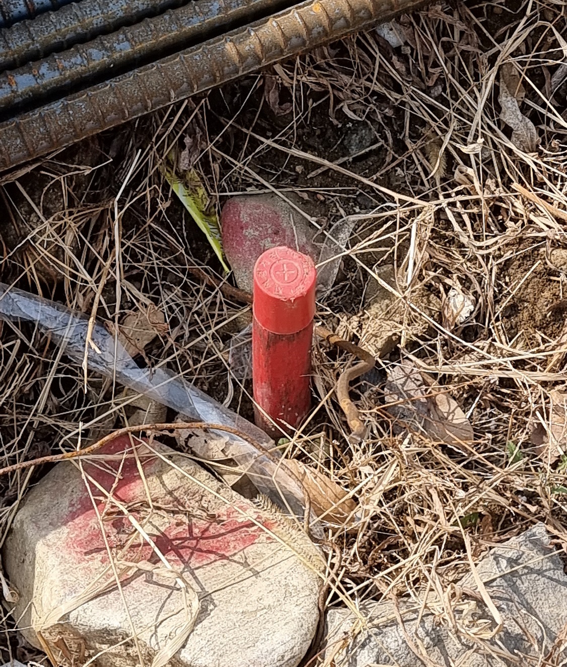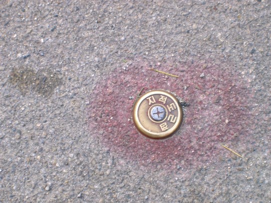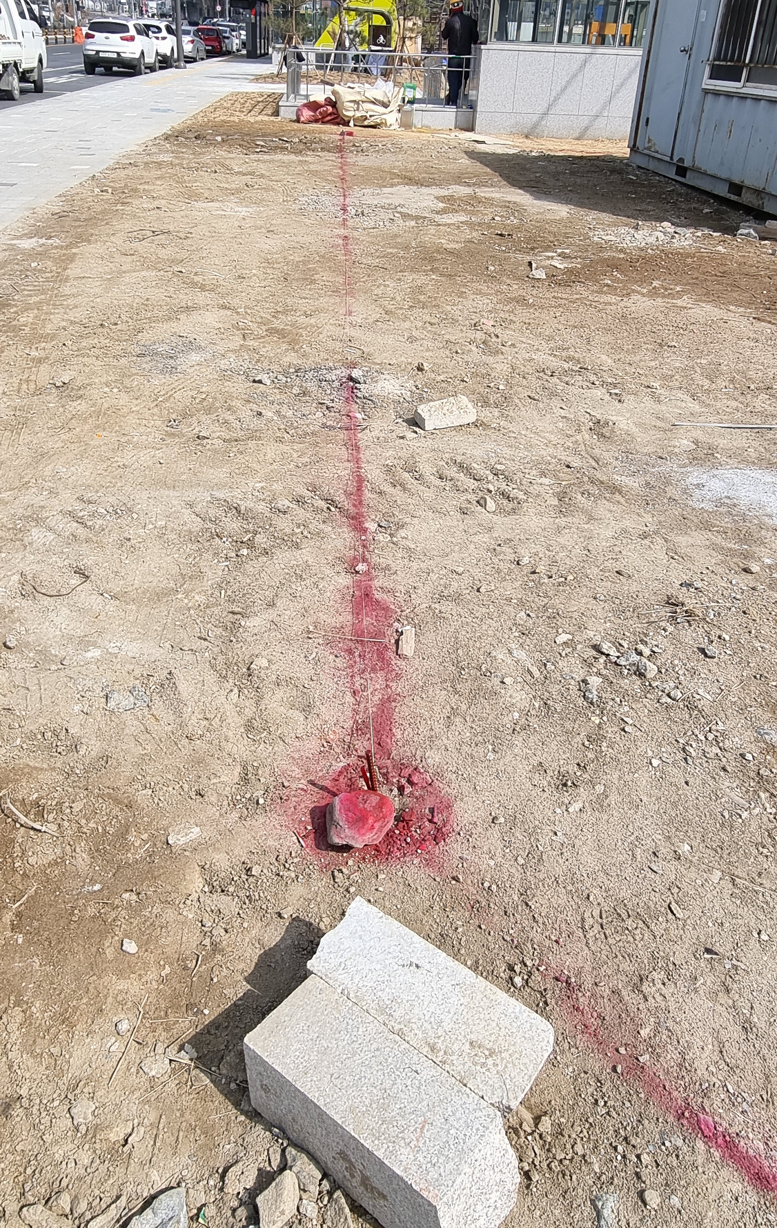 경계복원측량은 지적측량바로처리센터 홈페이지에 신청하면 됩니다. 이렇게 신청하면 지정된 날짜에 측량을 해주는데, 지적공부에 기록된 대지의 경계점을 실제 현장에 표시해줍니다. 이 경계점이 실제 대지인 셈입니다. 아래 사진에서 보면 대지 경계점에 막대를 막아서 표시했는데, 실제 도로보다 1m 정도 안쪽에 표시된 것을 볼 수 있습니다.
