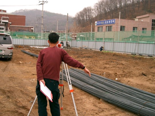 가설공사에서 가장 중요한 항목 중의 하나가 측량입니다. 설계도면은 지적도 상에서 건축물을 설계하고 배치하지만 실제 대지와 잘 맞지 않는 경우가 있습니다. 지적도는 오래 전에 실제 대지를 측량해서 축소한 형태로 기록한 것입니다. 아무래도 측량의 오차가 있을 뿐 아니라 시간이 오래 지나다 보면 알게 모르게 지적도에 맞지 않게 사용을 해 왔을 수도 있습니다. 따라서 현장에서 첫번째로 할 일은 지적도와 현재 상태의 대지를 맞추는 작업입니다.