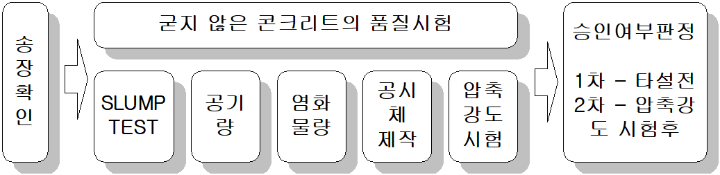 대부분의 건설재료는 품질을 확인한 후에 설치하지만 콘크리트는 콘크리트는 28일 지난 후에야 압축강도를 확인할 수 있기 때문에 적어도 한 달 가까이 지나야만 품질을 확인할 수 있습니다. 따라서 타설하는 시점에서는 현재의 상태에 콘크리트를 타설하기에 양호한 상태라는 것을 확인하고, 나중에 확인할 콘크리트의 압축강도 등이 양호하고 내구성도 양호할 것이라는 것을 확인할 필요가 있습니다. 품질 시험 항목이 많을 수 밖에 없고 또 매우 중요해질 수 밖에 없습니다.