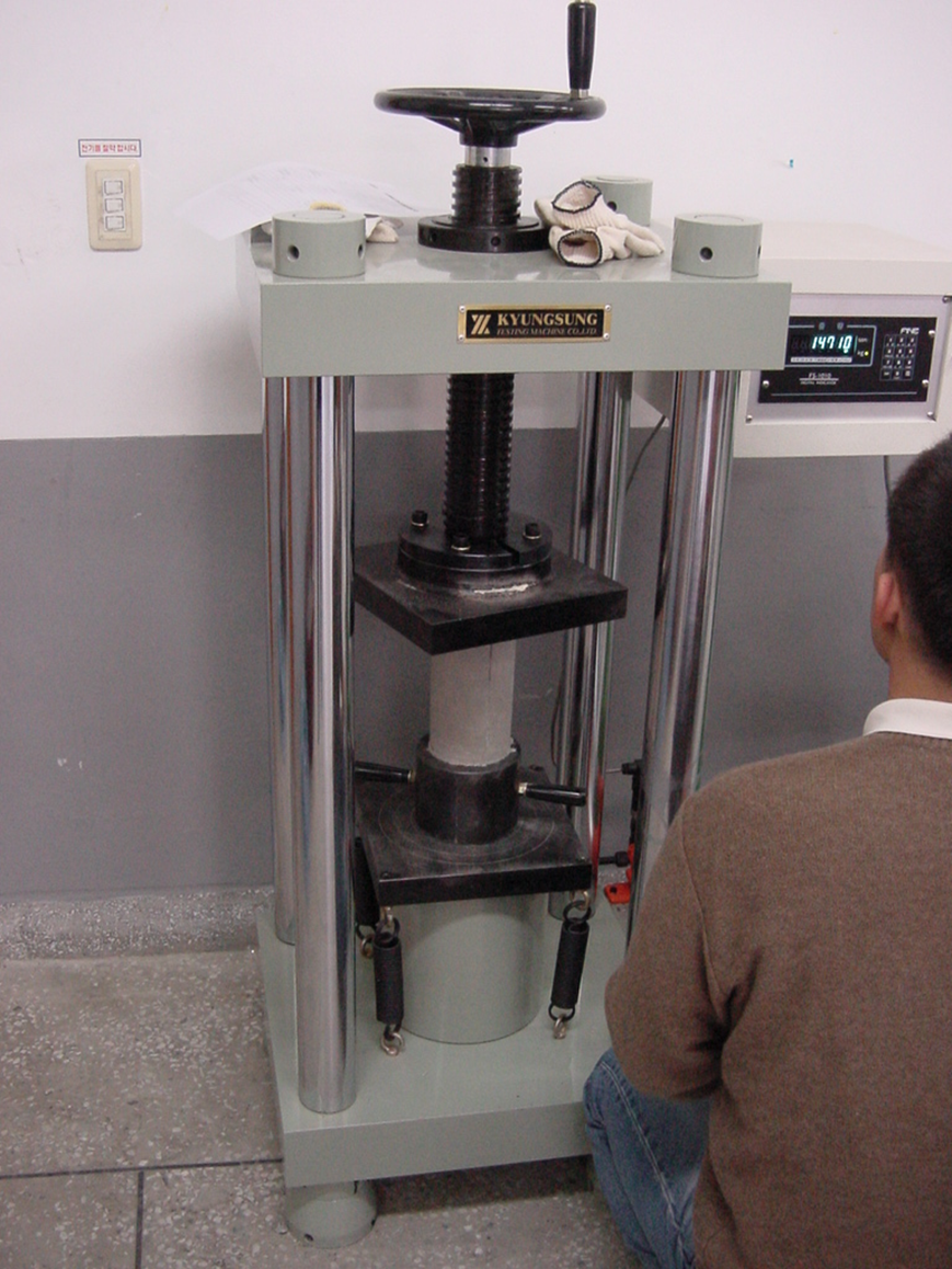압축강도 시험의 횟수는 1회/일, 또는 구조물의 중요도와 공사의 규모에 따라 120 m³ 마다 1회, 배합이 변경될 때마다 콘크리트 강도별 받아들이기 시점에 1회/일 또는 구조물의 중요도와 공사의 규모에 따라 120㎥ 마다 1회 실시합니다.