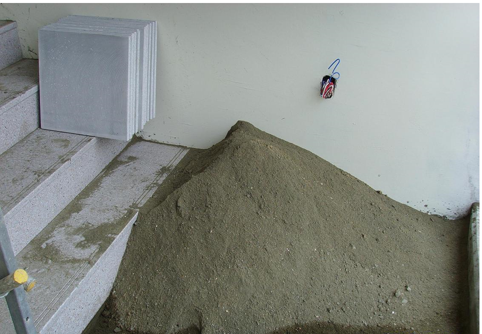 다음 사진은 바닥에 인조석을 붙이는 작업을 하기 위해 시멘트와 모래를 건비빔해 두었는데, 비오는 날 방치해 둔 모습입니다. 아무래도 시멘트 풍화를 생각한다면 필요한 양 만큼만 그때그때 비벼서 사용해야 나중에 인조석이 떨어지지 않을 것 같습니다.