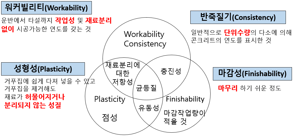 그 외에 시공 성능과 관련된 용어로 반죽질기, 성형성, 펌퍼빌리티 등이 있습니다.