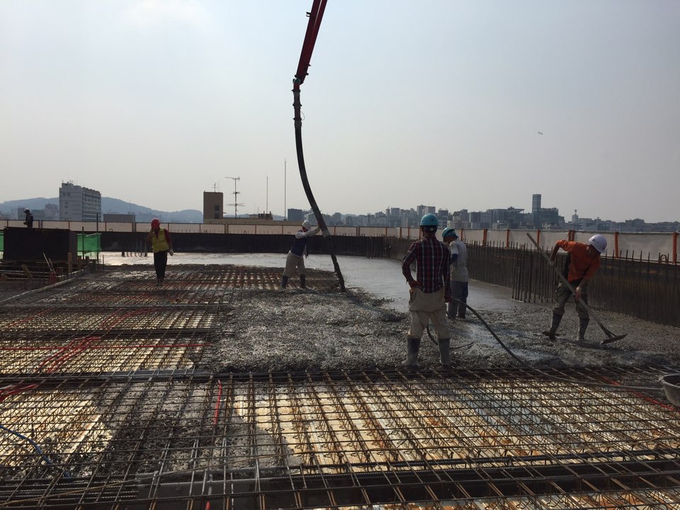 그런데 이 정도의 물만 가지고는 반죽이 너무 되기 때문에 시공하기가 불가능합니다. 보통은 레미콘으로 운반된 콘크리트를 타설하는데 높은 위치로 밀어 올리기 위해 콘크리트 펌프카 같은 장비를 사용해야만 합니다. 즉 반죽이 충분히 부드러워야 높은 곳으로 콘크리트를 밀어올릴 수 있게 됩니다.