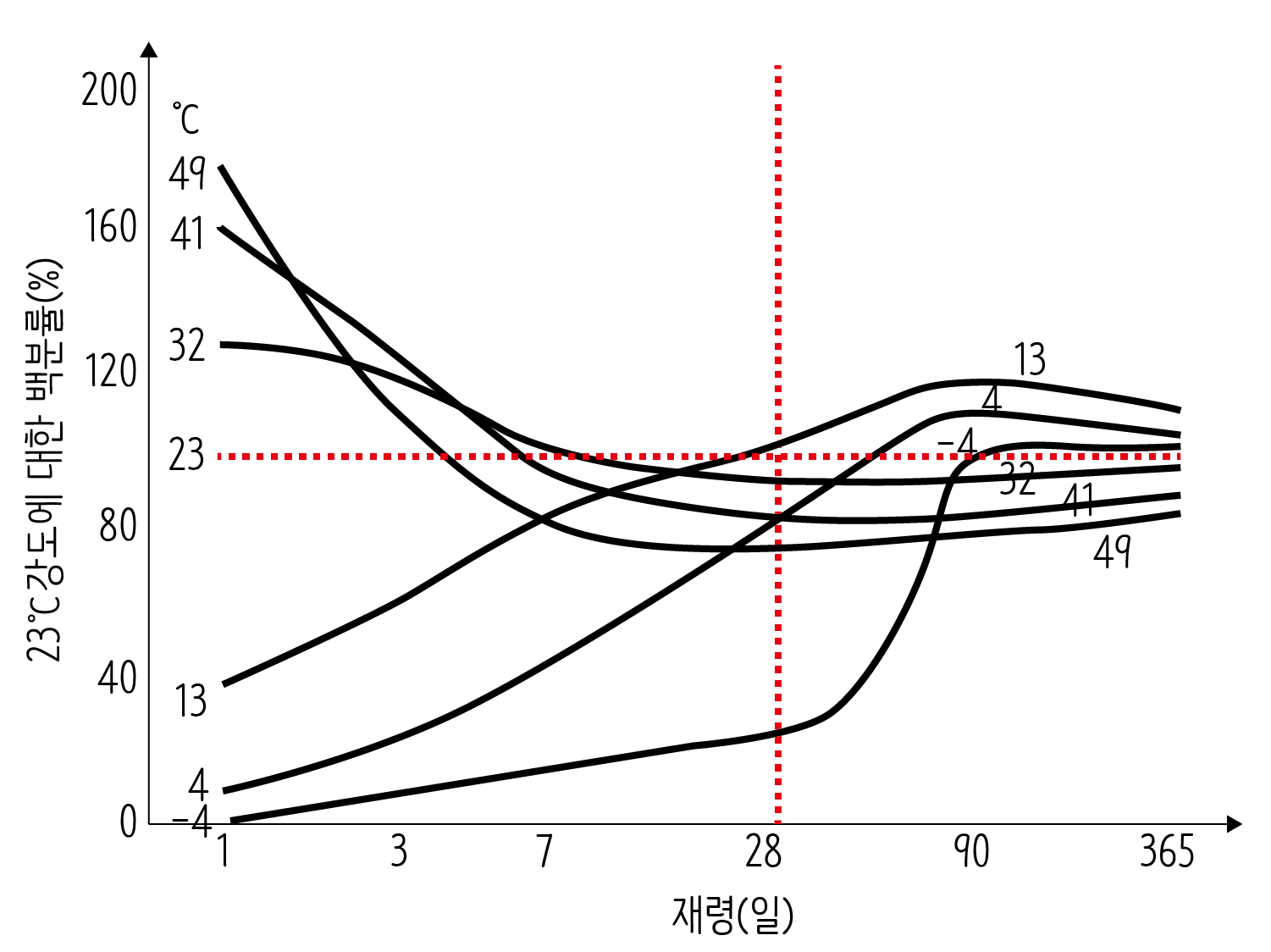 13℃ 이상이 되는 조건으로 양생한다면 강도가 매우 높게 나오는 것을 볼 수 있습니다. 28일을 기준으로 보더라도 23℃로 양생했을 때보다 강도가 높게 나올 뿐 아니라, 90일이 지나서도 강도가 높게 유지되는 것을 알 수 있습니다. 따라서 콘크리트의 강도가 최고가 되는 양생온도는 13 ∼ 23℃ 사이입니다.