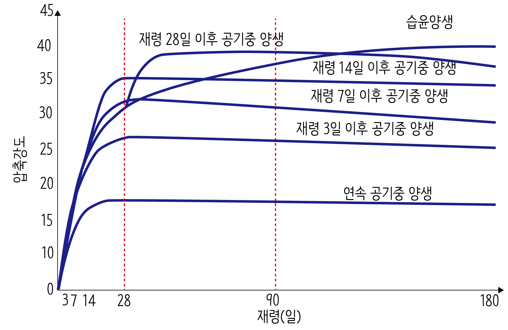 위 그래프는 일정한 조건(W/C = 50%)에서 습윤양생이 강도발현에 미치는 영향을 보여줍니다. 가장 강도가 낮게 나오는 것은 공기중에서 연속적으로 양생한 경우입니다. 공기중에서 양생을 하게 되면 물과 만나지 못하는 시멘트 입자가 있을 수 밖에 없어서 강도가 낮아지게 됩니다.