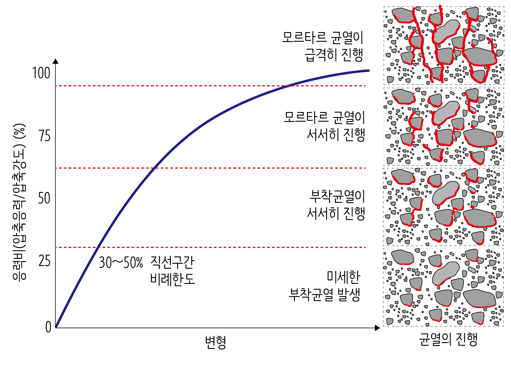 위 그래프는 콘크리트의 응력-변형도 곡선과 균열의 진행의 정도를 그림으로 나타낸 것입니다. 콘크리트의 응력-변형도 곡선을 보면 대략 30% 내외까지는 직선에 가까운 모양을 보입니다. 거의 탄성적으로 거동할 수 있는 구간이라고 할 수 있겠는데요. 콘크리트에 압축력이 가해지기 시작하면 콘크리트 내부에서는 가장 취약한 부분에서부터 균열이 발생하기 시작합니다.
