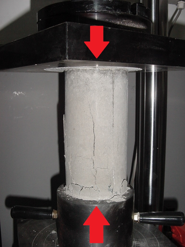 콘크리트가 파괴된 후의 사진을 보면 균열이 수직방향으로 크게 발생한 것을 볼 수 있습니다. 즉 콘크리트에 압축력이 가해지는 방향으로 균열이 발생됩니다. 공시체가 수직방향으로 눌리게 되면 양 옆으로는 늘어나게 되는데, 콘크리트가 인장력에 약하기 때문에 옆으로 당기는 힘에 저항하지 못하고 균열이 발생한다고 볼 수도 있습니다. 그럼 힘을 처음 받을 때부터 파괴될 때까지 콘크리트 내부에는 어떤 변화가 일어날까요?