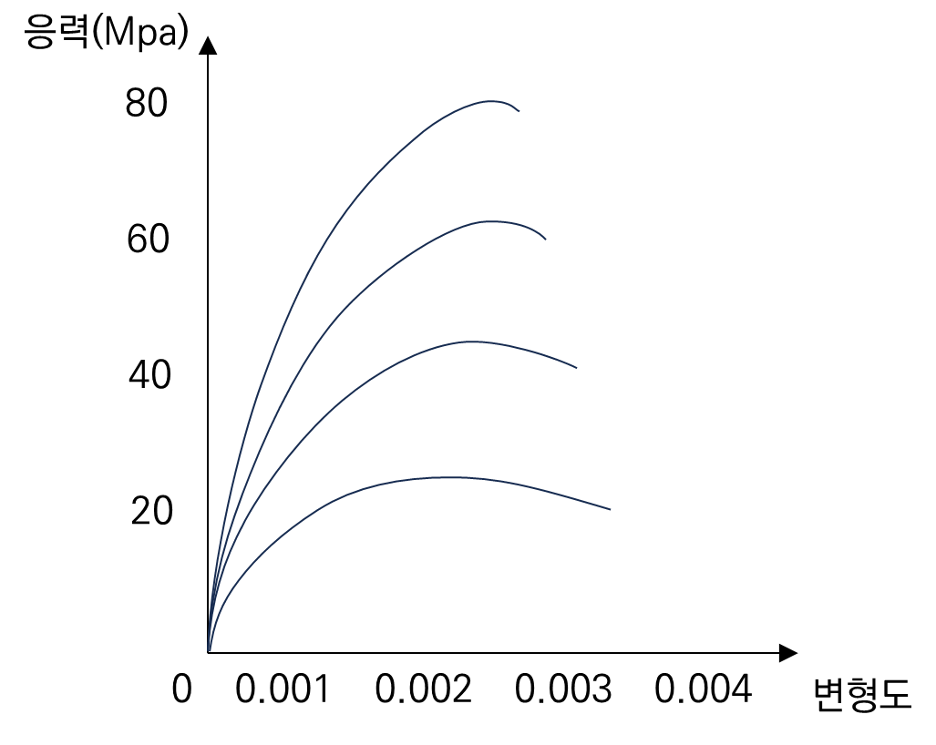 콘크리트가 고강도화가 될수록 최대강도점의 위치가 오른쪽으로 이동합니다. 즉 그래프에서 최대점의 위치가 고강도화가 될수록 오른쪽으로 약간씩 이동하는 것을 알 수 있습니다.