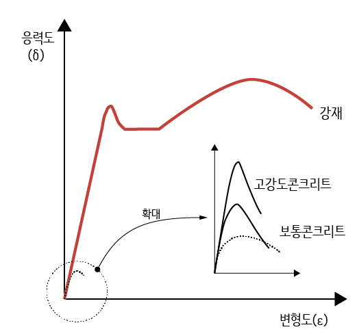 일단 고강도 콘크리트가 되면 탄성계수가 커집니다. 위 그림에서 보면 응력-변형도 곡선의 기울기가 더 급해(가파라)지면서 조금 더 세워진 모양이 됩니다. 탄성계수가 높아지면 변형에 대한 저항성능이 높아지게 됩니다. 즉 같은 힘이 작용한다고 가정한다면 보통 콘크리트보다는 변형이 더 작아지게 됩니다.