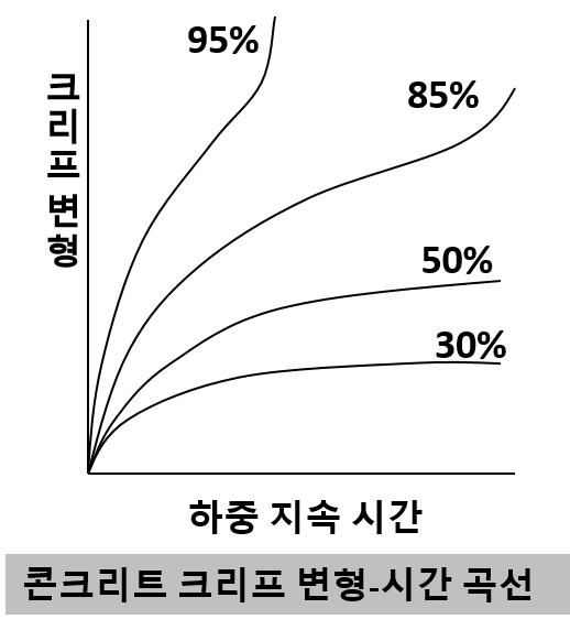 그러나 지속응력이 크기가 큰 경우 변형증가하다가 파괴에 이르게 됩니다. 위 그래프에서 85%와 95%라고 표기된 부분을 보시면 됩니다. 콘크리트는 정적강도에서 최대응력의 80% 이상의 지속하중이 작용하게 되면, 이처럼 크리이프 변형이 일정값을 넘어 콘크리트는 파괴됩니다. 즉 단기간에 하중이 작용한다면 자신이 버틸 수 있는 최대 응력의 100%까지 버틸 수 있지만, 만일 지속하중의 경우라면 버틸 수 있는 힘이 줄어든다는 것입니다. 지속하중이 작용하는 경우라면 자신이 버틸 수 있는 최대 응력의 80% 수준을 넘어선다면 파괴되고 말 것입니다.