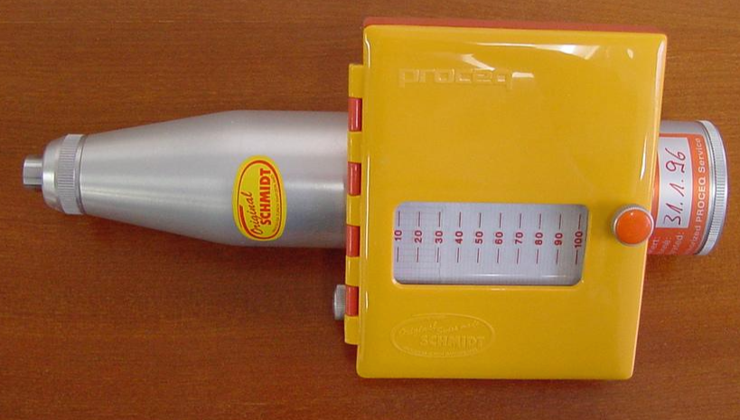 그런데 그렇게 하면 건축물에 구멍을 뚫어야 하기 때문에 손상을 입히게 됩니다. 당연히 손상을 입히지 않고 압축강도를 측정하면 좋겠죠? 그 방법을 1948년 스위스의 E. Schmidt 라는 사람이 개발했다고 하는데 지금까지 사용하고 있습니다.