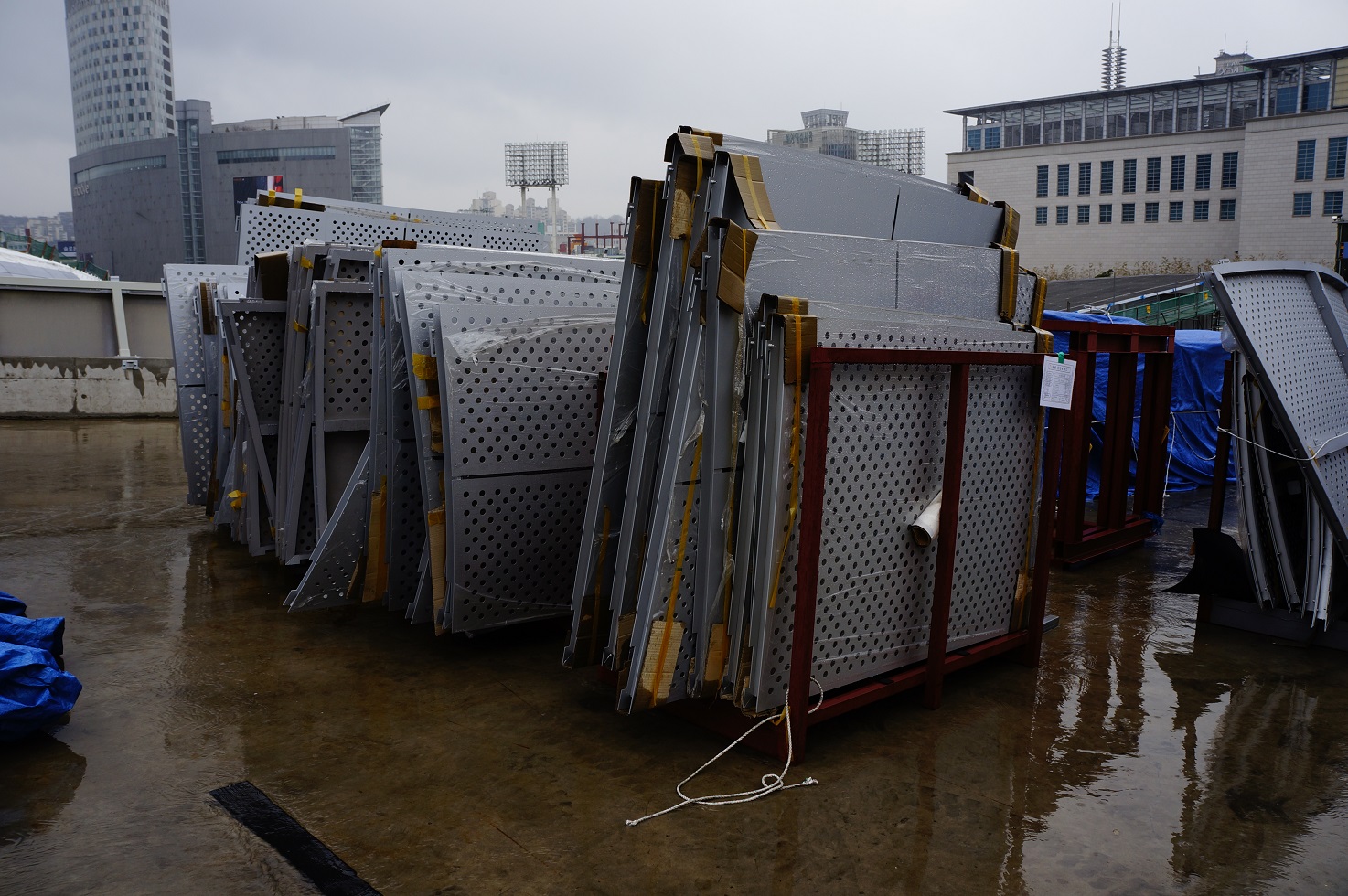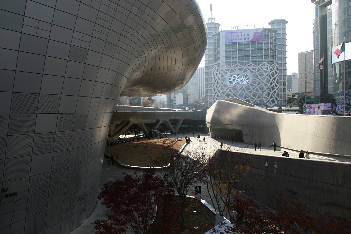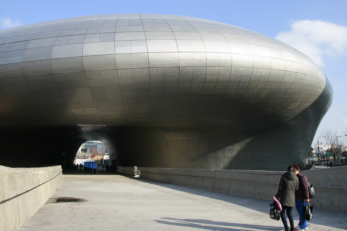 DDP에는 두께 4mm의 알루미늄 외장 패널이 사용되었는데, 4종류의 14가지 패턴이 조합되어 있습니다. 패널의 기준 크기는 1.6×1.2m인데 비정형 건물이기 때문에 동일한 크기의 패널이 없고 모두 다른 형태의 패널을 제작해서 부착했다고 합니다.