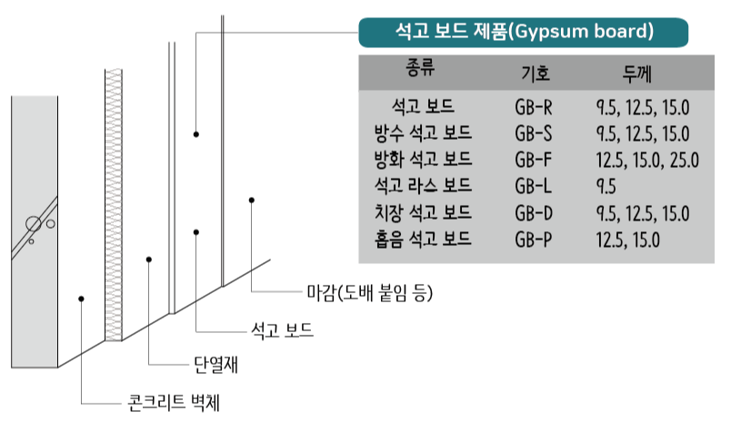 석고보드는 불연, 단열, 차음 성능이 있고 벽면에 붙이면 평활한 면을 만들 수 있어, 건축물의 천장이나 벽면에 최종 마감 면을 만들기 위해 사용됩니다.